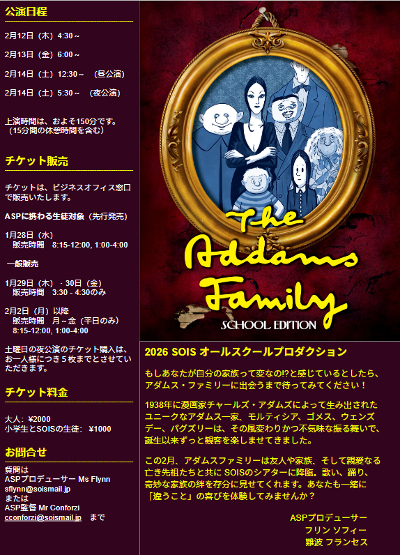 【2026 SOIS オールスクールプロダクション】ミュージカル『アダムス・ファミリー』上演のお知らせ