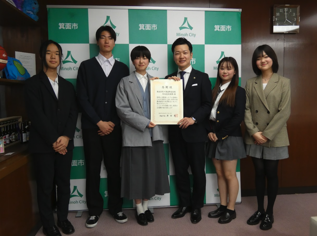 2026年3月24日(火)、日本語演劇部の代表5名が箕面市役所を表敬訪問し、原田亮箕面市長より感謝状を手渡されました。日本語演劇部は近隣の2つの高校とともに箕面市より「消費者トラブル防止」に役立つ演劇作成の依頼を受け、脚本を制作。実際に部員たちで公演を行い、それを録画してドラマを完成させました。